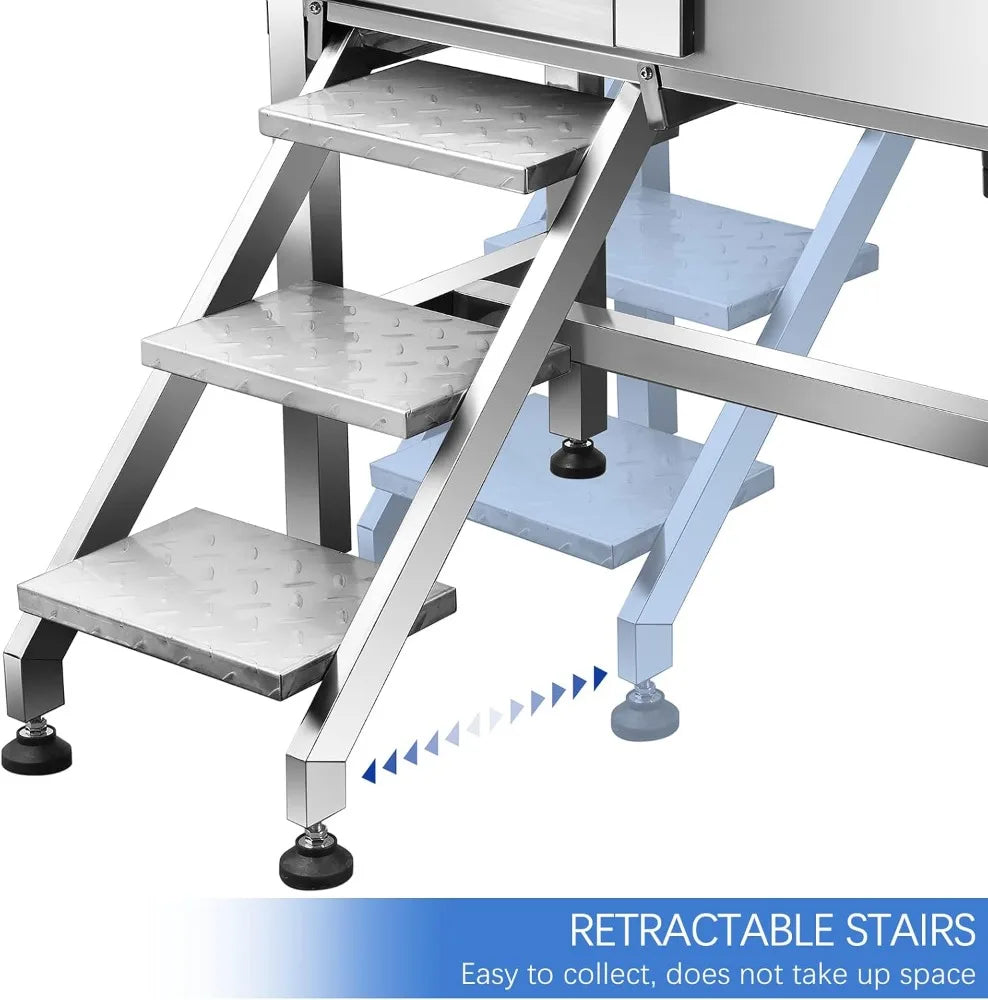 - Adjust the movable floor plate and folding stairs to fit small or medium dogs, then tuck the steps away to save space and speed up workflow.