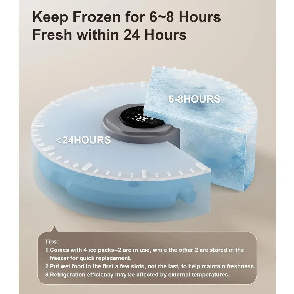• 【Never Compromise on Your Pet's Nutrition】 automatic dog feeder features 6 separate food compartments, ensuring precise portions for your pet. It accommodates not only kibbles but also wet, moist, various sized dry foods, and even snacks, supporting a balanced and scientific diet. To retain the freshness of wet/semi-moist/fresh foods, it comes with 4 reusable ice packs. 2 are in use, while the other 2 are stored in the freezer for quick replacement.