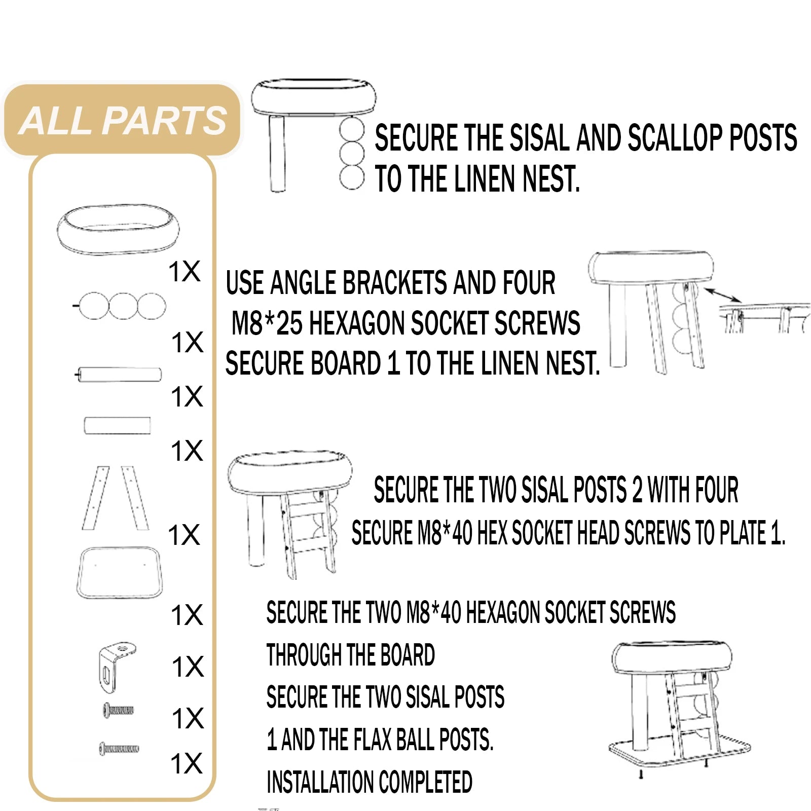 - You’ll enjoy three twine-wrapped posts that invite your cat to scratch and play.