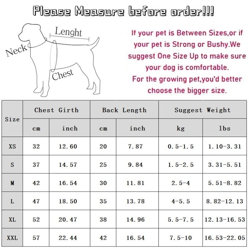 XXL=back length 42cm, bust 55cm, weight 7.5-10KG